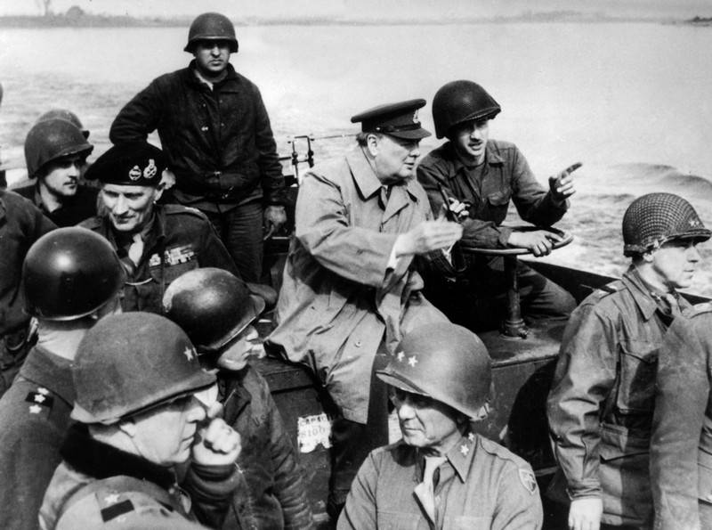 Черчилль и генерал Монтгомери (в берете) переправляются через Рейн вместе с войсками союзников. 25 марта 1945 г.