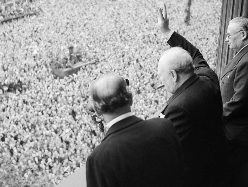 Черчилль приветствует собравшихся на Уайтхолл в день радиообращения к нации по случаю победы в войне с Германией. 8 мая 1945 г.