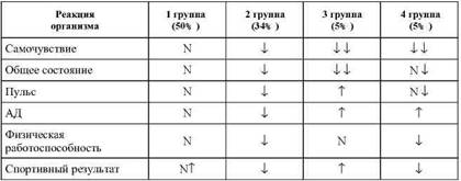 Примечание. N – нормальная и хорошая реакция, 4– – снижение, 4-4– – значительное снижение, ТТ – увеличение. Снижение некоторых показателей у спортсменок 1-3 групп, как правило, не повторяется из цикла в цикл.