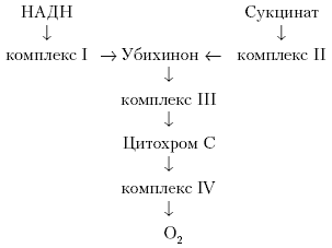 Принято считать, что митохондриальная цепь состоит из четырех групп ферментов и белков, компактно локализованных во внутренней мембране митохондрий (Рубин А., Шинкарев В.П.). Подобные группы ферментов принято называть комплексами. Перенос восстановительных эквивалентов от комплекса к комплексу может быть реализован только с использованием низкомолекулярных переносчиков, способных участвовать в окислительно-восстановительных реакциях. Подобных переносчиков в организме известно два: убихинон, цитохром С.