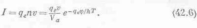 Как определить число электронов, покидающих металл за 1 сек? Очень трудно перечислить все, что может повлиять на выход электрона: легче решить задачу по-другому. Представим, что мы не удаляем вылетевшие электроны, а электроны образуют нечто вроде газа и могут вернуться в металл. В этом случае существует вполне определенная равновесная плотность электронов, которая определяется такой же формулой, как (42.1), где Va, грубо говоря, — объем, отведенный в металле одному электрону, a W=qej (j —так называемая работа выхода, или разность потенциалов, необходимая для того, чтобы вырвать электрон с поверхности металла). Эта формула подскажет нам, сколько электронов должно находиться в окружающем пространстве и проникать в металл, чтобы скомпенсировать потерю тех электронов, которые покинули металл. Теперь легко подсчитать, сколько электронов уйдет из металла, если мы будем непрерывно откачивать их, потому что число ушедших электронов в точности равно числу электронов, которые должны были бы вернуться в металл, если существовал электронный «пар», плотность которого определяется формулой (42.1). Иначе говоря, электрический ток через единичную площадку равен произведению заряда электрона на число электронов, проходящих за 1 сек через площадку единичной площади; последнее равно произведению числа электронов в единичном объеме на скорость: поэтому, как мы уже много раз видели,