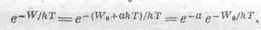 в металле правильно описывает квантовая, а не классическая механика, но правильный множитель лишь немного отличается от нашего. Фактически до сих пор никто еще не смог точно вычислить этот множитель, хотя многие при расчетах пользовались квантовыми формулами высшего класса. Основная задача состоит в том, чтобы выяснить, не меняется ли W хотя бы медленно с температурой? Если да, то медленно изменяющуюся с температурой величину W нельзя отделить от предэкспоненциальных коэффициентов. Если, например, W зависит от температуры линейно, так что W= W0+akT, тоТакая линейная зависимость W от температуры эквивалентна измененной «постоянной». Попытка точного вычисления пред-экспоненциального множителя очень трудна и обычно бесплодна.