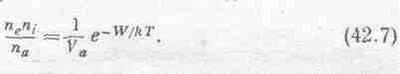 Прежде всего эти числа подчиняются двум условиям или связям. Например, можно как угодно менять различные условия, температуру и т. д., но сумма na+niвсегда останется одной и той же, потому что это просто-напросто N — число атомных ядер в ящике. Если в единице объема число ядер сохраняется постоянным, а изменяется, скажем, температура, то, хотя в результате ионизации некоторые атомы превращаются в ионы, общее число атомов и ионов не изменяется. Значит, ne+ni.=N. Другое условие вытекает из того, что если газ в целом электрически нейтрален (и если мы пренебрегаем двойной или тройной ионизацией), то число ионов всегда равно числу электронов, или nе=ni. Эти дополнительные условия просто выражают сохранение заряда и сохранение атомов.