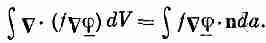 Продифференцировав левую часть, я могу показать, что она в точности равна правой. Это уравнение подходит для того, чтобы провести интегрирование но частям. В нашем интеграле DU* мы заменяем Сj·Сf на —fС2j+С·(fС j) и затем интегрируем это по объему. Член с дивергенцией после интегрирования по объему заменяется интегралом по поверхности: