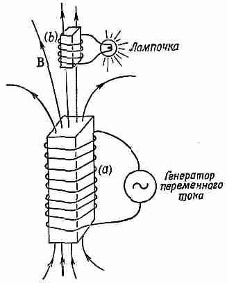 Присоединим теперь одну из катушек — катушку а — к генератору переменного тока. Непрерывно меняющийся ток создает непрерывно меняющееся магнитное поле. Такое изменяющееся магнитное поле генерирует переменную э. д. с. во второй катушке — катушке b. Эта э. д. с., например, способна заставить гореть электрическую лампочку.