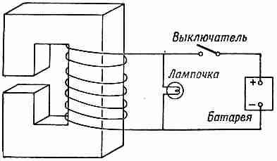 Любой большой электромагнит обладает большой самоиндукцией. Пусть, например, к катушке большого электромагнита присоединена батарея (фиг. 16.6) и пусть установилось большое магнитное поле. (Ток достигает постоянной величины, определяемой напряжением батареи и сопротивлением провода катушки.)