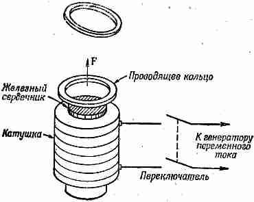 Фиг. 16.7. Проводящее кольцо сильно отталкивается электромагнитом, когда в нем меняется ток.