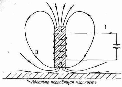 Фиг. 16.8. Электромагнит вблизи идеально проводящей плоскости.