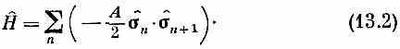 Некоторые задачи мы сможем разобрать на простом примере, когда все атомы лежат на одной прямой — случай одномерной решетки. Все эти представления вы потом легко сможете распространить на трехмерную решетку. Возле каждого атома имеется электрон; у него есть два возможных состояния — либо спином вверх, либо вниз, и вся система описывается перечислением направлений спинов. В качестве гамильтониана системы возьмем оператор энергии взаимодействия. Интерпретируя спиновые векторы (13.1) как сигма-операторы, или сигма-матрицы, мы напишем для линейной решетки