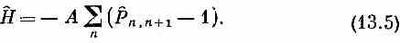 Как же действует гамильтониан (13.5) на состояние |x5>? Один из членов гамильтониана это, скажем, — А (Р^7,8– 1). Оператор P^7,8 обменивает спинами два соседних атома № 7 и № 8. Но в состоянии |x5> они оба направлены вверх, так что ничего не меняется; Р^7,8 равнозначно умножению на единицу: