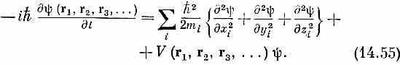Шредингера, хотелось бы продемонстрировать, как оно выглядит для системы многих частиц. Мы не будем им пользоваться, а просто хотим показать вам его, чтобы подчеркнуть, что волновая функция y не просто обычная волна в пространстве, а функция многих переменных. Если частиц много, уравнение превращается в