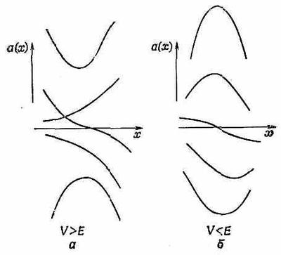 Если же потенциальная функция V меньше энергии Е, то знак второй производной а (х) по х противоположен знаку самой а(х)и кривая a(х)будет всегда вогнута к оси х, подобно одной из линий на фиг. 14.4, б. Решение на этом участке приобретет форму кусочков синусоид.