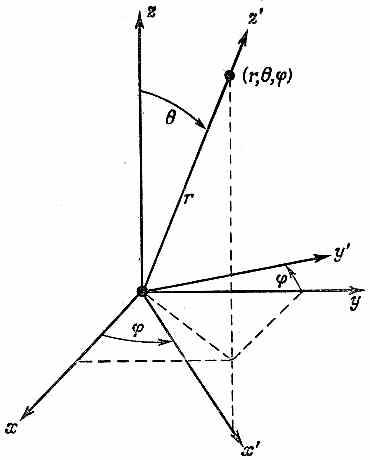 Представим себе некоторое возможное состояние электрона; внутренняя угловая структура этого состояния будет определяться квантовым числом l. В зависимости от «ориентации» полного момента количества движения относительно оси z его проекция т на ось z может равняться одному из 2l+1 чисел между +l и -l. Пусть, например, m=1. С какой амплитудой электрон окажется на оси z на расстоянии r от начала? С нулевой. Электрон на оси z не может иметь какого-либо орбитального момента относительно этой оси. Но пусть тогда m=0. Вот это другое дело; теперь уже может появиться не равная нулю амплитуда того, что электрон окажется на оси z на таком-то расстоянии от протона. Обозначим эту амплитуду Fl(r). Это — амплитуда того, что электрон будет обнаружен на расстоянии r по оси z, когда атом находится в состоянии | l, 0>, т. е. в состоянии с орбитальным моментом l и его z– компонентой m=0. А если нам известно Fl(r), то известно все. Теперь уже в любом состоянии |l, m>мы можем узнать амплитуду ylm (r) того, что электрон обнаружится в произвольном месте атома. Как мы это узнаем? А вот следите. Пусть у нас есть атом в состоянии | l, m>. Какова амплитуда того, что электрон обнаружится под углом q, j и на расстоянии r от начала? Проведите новую ось z, скажем z', под этим углом (фиг. 17.3) и задайте вопрос: какова амплитуда того, что электрон окажется на новой оси z на расстоянии r?