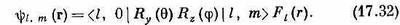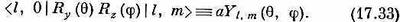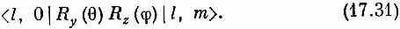 Орбитальное движение может обладать только целыми значениями l. (Если электрон может быть обнаружен в любом месте, где r№0, то имеется некоторая амплитуда того, что в этом направлении будет m=0. А состояния с m=0бывают только при целых спинах.) Матрицы поворота для l=1 приведены в табл.15.2 (стр. 129). Для больших l вы можете воспользоваться общими формулами, выведенными в гл. 16. Матрицы Rz(j) и Ry(q) написаны по отдельности, но как их комбинировать, вы знаете. В общем случае вы начнете с состояния | l, m> и подействуете на него оператором Rz(j), получив новое состояние Rz(j)|l, т>(которое просто равно eimj|l, m>). Затем вы подействуете на это состояние оператором Ry(q) и получите состояние Ry(q) Rz(j) |l, m>. Умножение на <l, 0| даст вам матричный элемент (17.31).
