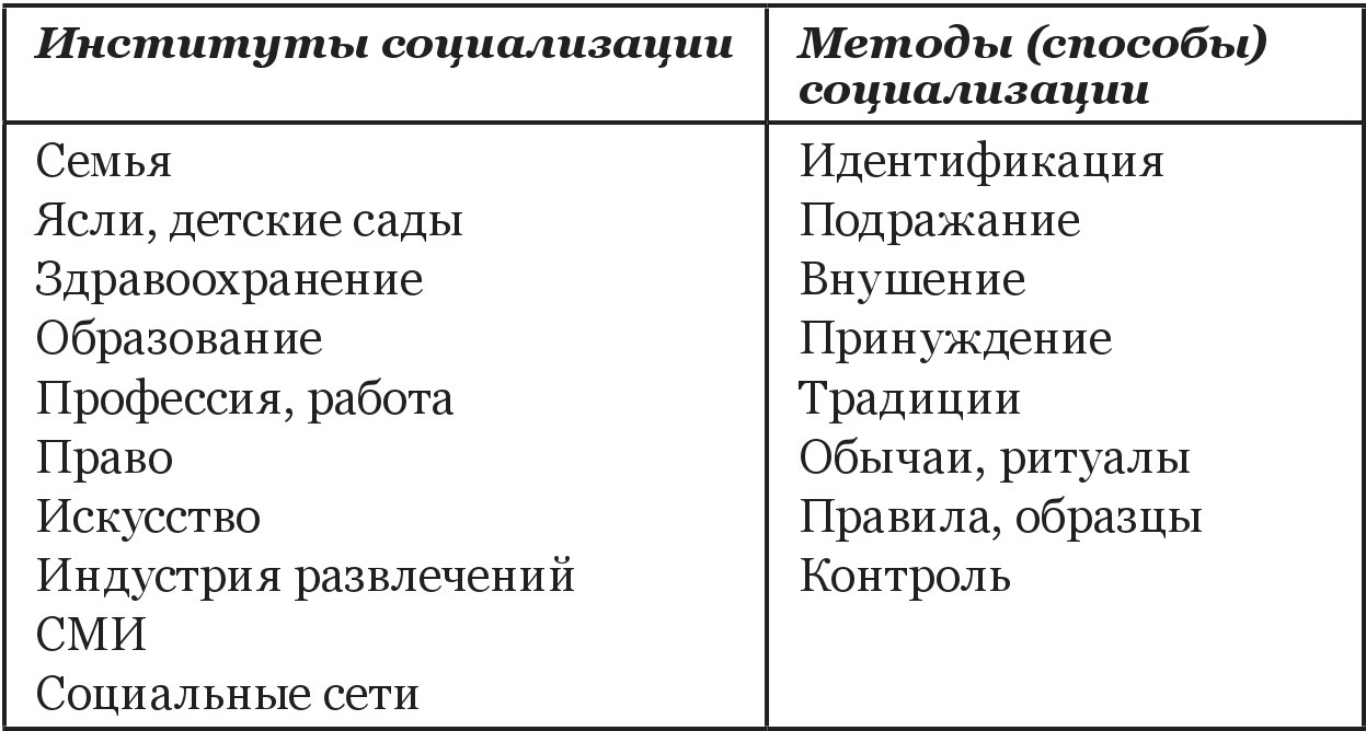 социально – культурной деятельности.Механизмы социализации хорошо известны. Прежде всего, это подражание – родителям, сверстникам, учителям, коллегам, артистам, моделям, просто ярким привлекательным людям. Вариант систематического представления институтов и методов социализации представлен в Табл. 1.4.