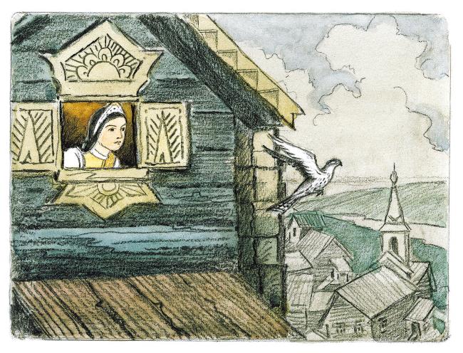 И явился ей молодец красоты неописанной. К утру молодец ударился об пол и сделался соколом. Отворила ему Марьюшка окно, и улетел сокол к синему небу.