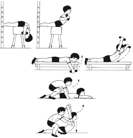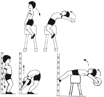 5. Сходные проблемы возникают и при глубоком наклоне назад из положения стоя и сильном прогибе позвоночника в поясничном отделе (20, 134, 188, 194, 198, 201, 206, 215, 231, 267– 69, 276, 305, 414, 432, 435, 449, 450, 451, 453, 455, 460, 462, 468 из серии упражнений для воспитания гибкости; 454 из серии упражнений для воспитания ловкости; 810, 813 из серии упражнений для воспитания силы).
