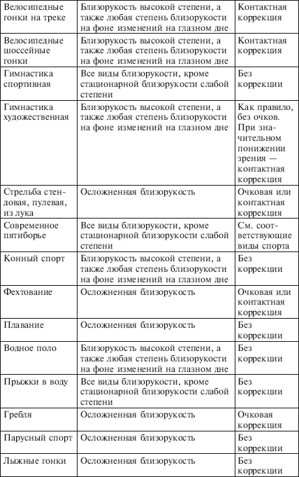 Лица, имеющие дальнозоркость +4,0Д и выше, при снижении относительной остроты зрения, когда коррекция является обязательной, могут быть допущены к занятиям только теми видами спорта, где допустимо использование очков. При этом очки должны быть легкими, прочно фиксированными, обладать высокими оптическими свойствами, а в летнее время иметь желто-зеленые светофильтры.