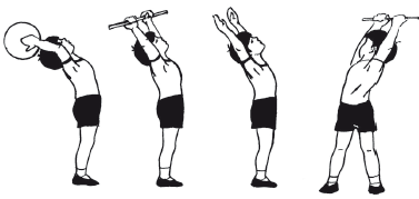 9) вдох – поднять гимнастическую палку вверх с поворотом туловища в сторону, выдох – наклонить туловище вперед.