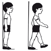 1. Принятие правильной осанки за счет касания стены или гимнастической стенки ягодичной областью, икроножными мышцами и пятками. Отойти от стены на 1–2 шага, сохраняя правильную осанку.