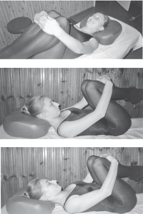 Упр. 1. И.п. – лежа на спине, ноги согнуты в коленях и тазобедренном суставе, колени приведены к груди, руки удерживают колени, под головою поролоновый валик (соответствует по толщине длине надплечия пациента). Голова плашмя (без разгибания) вжимается в поролон на фазе вдоха и удерживается 3–5 с (рис. 1–3). Повторить 5-10 раз.