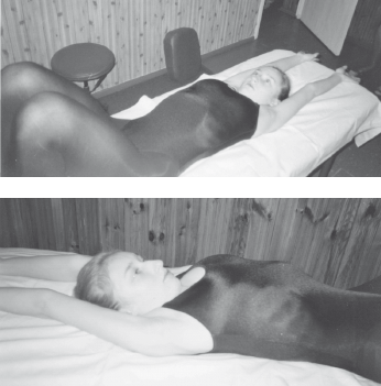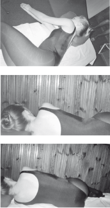 Упр. 4. И.п. – лежа на спине, ноги согнуты, руки запрокинуты назад и лежат вдоль головы. При вдохе руки максимально вытягиваются вдоль опорной поверхности (необходимые предметы: коврик, поролоновая подушка, по толщине соответствующая расстоянию надплечия пациента) (рис. 12–14).