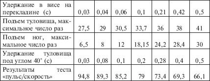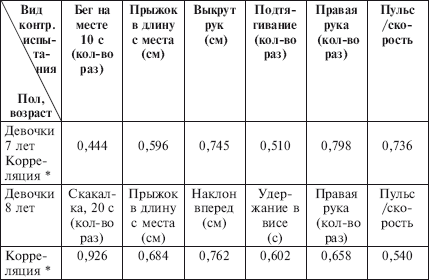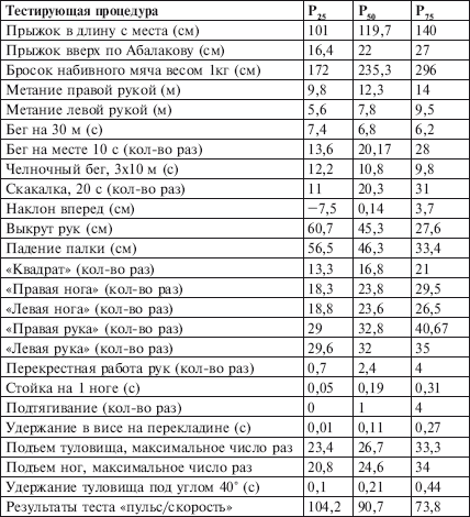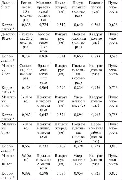Согласно результатам факторного и корреляционного анализов, комплексы подобных испытаний для детей разного возраста и пола должны выглядеть следующим образом: девочки 7 лет: бег на месте 10 с, подтягивание, прыжок в длину с места, выкрут рук, «правая рука», пульс/скорость; девочки 8 лет: прыжки на скакалке 20 с, удержание в висе, прыжок в длину с места, наклон вперед, «правая нога», пульс/скорость; девочки 9 лет: бег на месте 10 с, наклон вперед, подъем туловища, метание правой и левой руками, падение палки, пульс/скорость; девочки 10 лет: прыжки на скакалке 20 с, подъем туловища, бросок мяча 1 кг, выкрут рук, «квадрат», пульс/скорость; мальчики 7 лет: прыжки на скакалке 20 с, подъем туловища, бросок набивного мяча весом 1 кг, выкрут рук, «квадрат», «правая рука», пульс/скорость; мальчики 8 лет: 3х10 м, удержание в висе, прыжок в высоту с места, выкрут рук, «квадрат», пульс/скорость; мальчики 9 лет: 3х10 м, подъем туловища, прыжок в длину с места, наклон вперед, перекрестная работа, пульс/скорость; мальчики 10 лет: 3х10 м, удержание в висе, бросок набивного мяча весом 1 кг, выкрут рук, «квадрат», пульс/скорость.