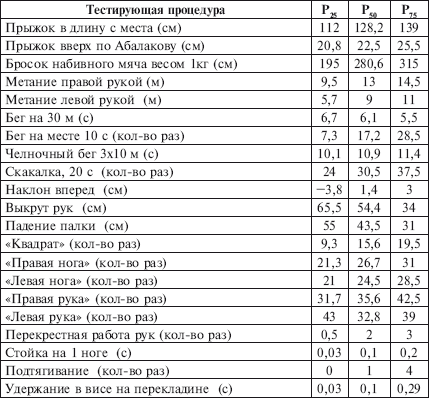 Разработанные по этому принципу общепринятые нормативы (Р3, Р10, Р25, Р50, Р75, Р90, Р97) основных показателей физической подготовленности для средних, а также ниже и выше средних значений длины тела у обследуемого контингента лиц приведены в табл. 5–7 и приложениях 14–34.