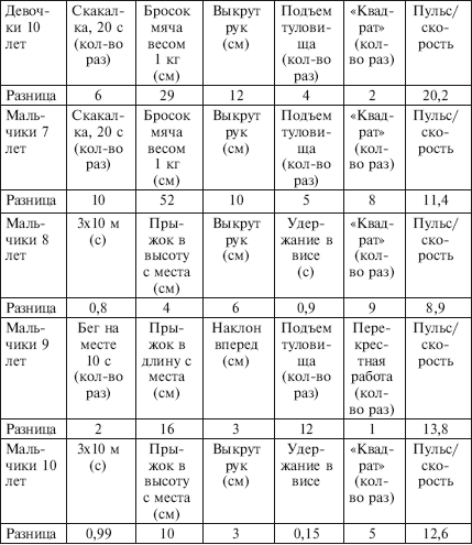 В связи с этим нами были проанализированы результаты экспериментальных исследований 240 детей 7-10 лет (по 30 человек в каждом возрасте), показанные ими в отдельных контрольных испытаниях в начале и конце учебного года.