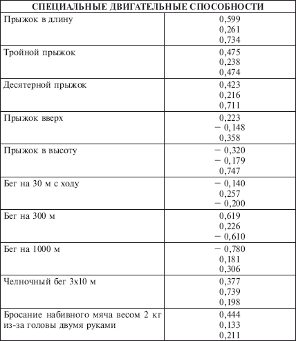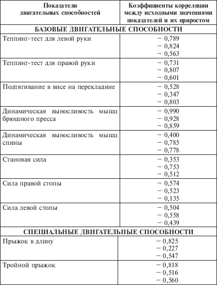 Взаимосвязь исходных значений и прироста показателей базовых и специальных двигательных способностей у учащихся трех специализированных легкоатлетических классов, исходное обследование 11–13 лет, заключительное обследование 14–15 лет (по С. А. Локтеву, 1994)
