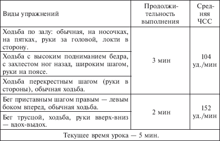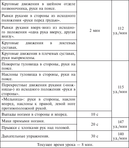 С этой целью нами были проанализированы 18 уроков продолжительностью 30 мин в специальных медицинских группах (сделаны видеосъемка и хронометраж занятий), проводимых четырьмя разными преподавателями.