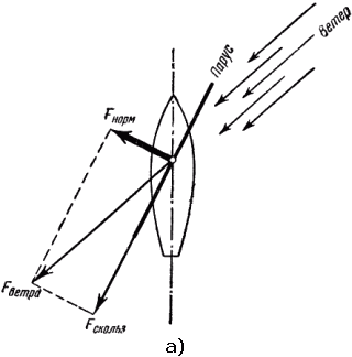другая – нормальная составляющая – оказывает давление на парус. Во-вторых, лодка движется не туда, куда ее толкает сила ветра, а туда, куда смотрит нос лодки.Это объясняется тем, что движение лодки поперек килевой линии встречает очень сильное сопротивление воды. Значит, чтобы лодка двигалась носом вперед, надо, чтобы сила давления на парус имела бы составляющую вдоль килевой линии, смотрящую вперед.