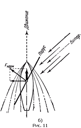 Возможность лавировать против ветра основывается на двух обстоятельствах. Во-первых, ветер толкает парус всегда под прямым углом к его плоскости. Посмотрите на рис. 11, а: сила ветра разложена на две составляющие – одна из них заставит воздух скользить вдоль паруса,
