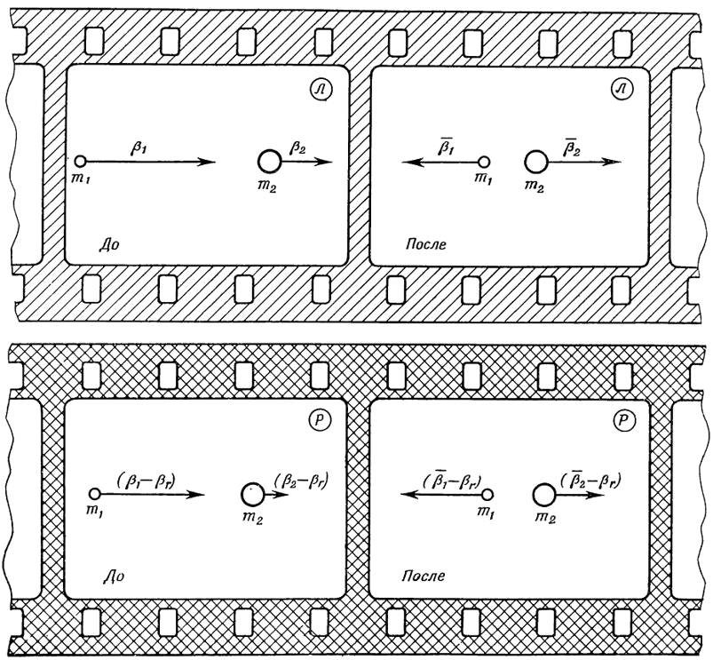 в котором величина отрицательна в случае указанных на этом рисунке направлений движения. Чёрточки над буквами означают, что соответствующие величины взяты после соударения. Рассмотрим теперь этот же процесс в системе отсчёта ракеты. При малой относительной скорости движения ракеты r скорость каждой частицы в системе отсчёта ракеты находится путём простого вычитания r из скорости этой частицы в лабораторной системе отсчёта. Примените ньютоновский закон сохранения импульса к столкновению с точки зрения системы отсчёта ракеты. Покажите, что если ньютоновский импульс сохраняется в лабораторной системе отсчёта, он будет автоматически сохраняться и в системе отсчёта ракеты, движущейся с малой скоростью относительно лабораторной системы отсчёта.