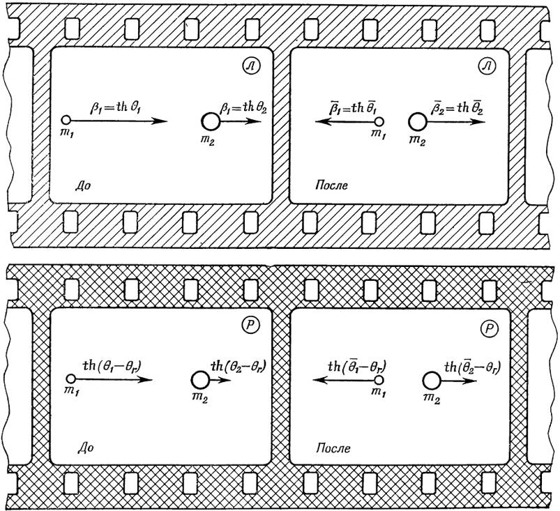 При этом массы обеих частиц остаются неизменными, так как столкновение является упругим. В случае указанных на рис. 103 направлений движения величина отрицательна. В релятивистской механике скорости частиц в системе отсчёта ракеты могут быть найдены путём вычитания параметра относительной скорости r из параметра скорости этих частиц в лабораторной системе отсчёта (см. стр. 69). Примените закон сохранения импульса к этому столкновению, рассматриваемому в системе отсчёта ракеты. Используйте данные табл. 8 (стр. 77—78) для того, чтобы преобразовать все гиперболические синусы, зависящие от разностей параметров скорости. В полученном уравнении перегруппируйте члены, объединяя те из них, которые содержат ch r или sh r:
