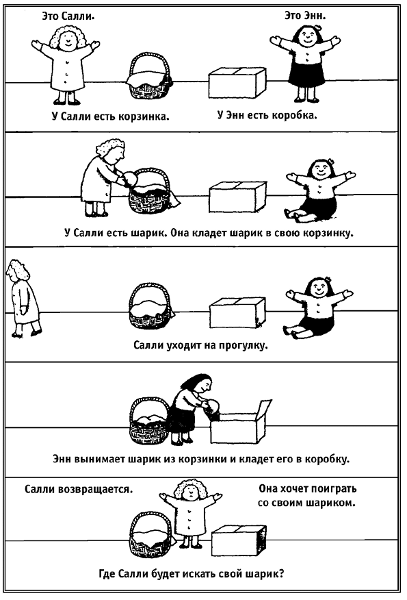 Дети-аутисты являются ярким исключением из правила, согласно которому люди всегда обращают внимание на глаза. Эти дети обычно обращают внимание на губы. Подрастая, они демонстрируют недостаток умения «влезть в чужую шкуру», способности понимать других – и в познавательном, и в эмоциональном смысле – то, что называют дефицитом модели психического состояния. Как показывает ставший уже классическим эксперимент под названием «Тест Салли-Энн» (рис. 2.11), большинство детей приобретает начатки этой модели приблизительно к четырем годам.