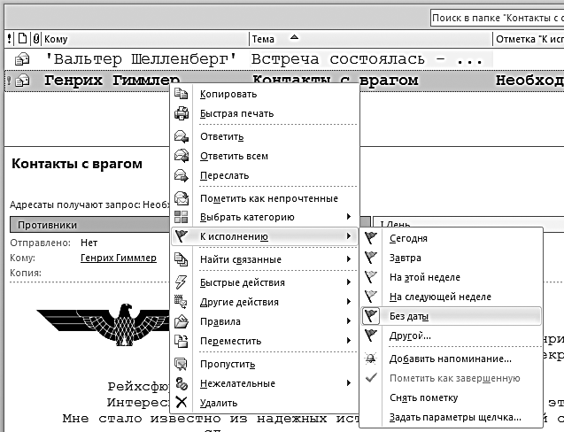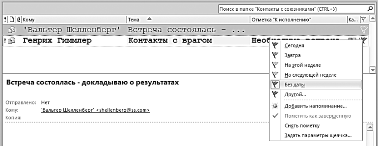 Поставив на письме один из флагов к исполнению (их несколько, разных цветов), вы фактически превращаете письмо в задачу. С этого момента в Outlook 2010 и 2007, в отличие от предыдущих версий, оно видно в панели задач при календаре, его так же, как и любую задачу, можно помещать в категории «1-День» и «1-Неделя» и контекстные категории («Шеф», «Клиенты», «Поставщики» и т. д.). Письмо становится полноправным элементом вашей системы управления задачами.