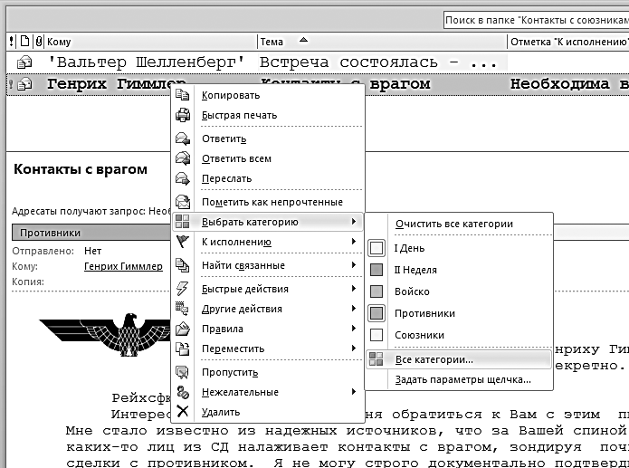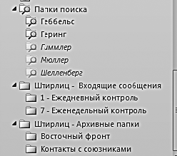 писем. Эта папка просматривается еженедельно. Действия с письмом те же, что и при просмотре папки «1-Контроль»: либо решить вопрос и ответить на письмо, либо снять вопрос с контроля, либо оставить его пока на контроле.Вот, например, структура папок Штирлица: «Входящие», две контрольные папки («Ежедневный контроль» и «Еженедельный контроль»), архивные папки («Восточный фронт» и «Контакты с союзниками»), а также папки поиска.