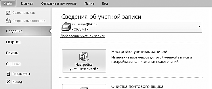 1. В меню Файл / Сведения выберите пункт «Настройка учетных записей».