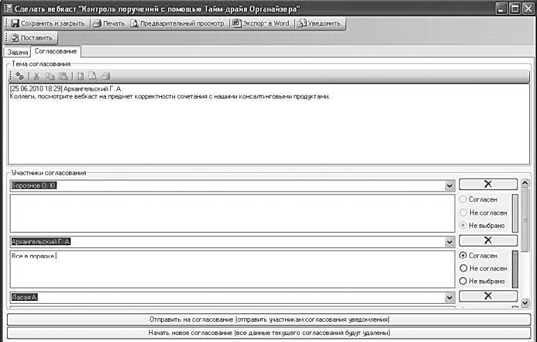 постановщик задачи может сразу определить, чье согласование для него является показателем корректного выполнения задачи. На специальной вкладке «Согласование» (см. рис.) он выбирает участников согласования и затем видит на этой же вкладке их одобрение или неодобрение, с комментариями.Согласование происходит параллельно, то есть следующему «согласанту» не нужно дожидаться мнения предыдущего. Если по итогам согласования произошли существенные изменения в исходном документе, организатор согласования может отправить его на повторное согласование.