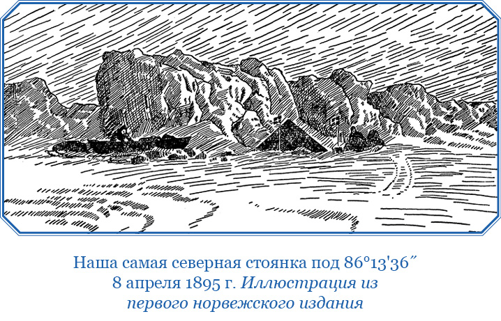 Сегодня как бы для разнообразия небо оказалось облачным; однако вечером, когда мы сидели за вторым завтраком, оно прояснилось и сквозь стенки палатки снова дружески просвечивало солнце. Иохансен чинил одежду, пока я занимался вычислениями и наносил на карту наш путь. Такой мягкой погоды и приятного отдыха у нас еще не бывало: в 10 часов вечера температура равнялась –25,6 °С».