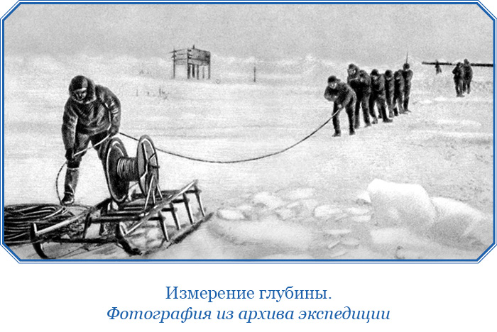 «Четверг, 1 марта. Стоим почти неподвижно. Прекрасная, мягкая погода, только –19 °С, небо пасмурно, легкий снежок и слабый ветер. Попытались сегодня измерить лотом глубину, надставив наш пеньковый лот-линь обыкновенным стальным тросом. Но последний оторвался вместе с лотом. Укрепили новый лот и вытравили весь линь длиной в 3475 метров, но дна не достигли.