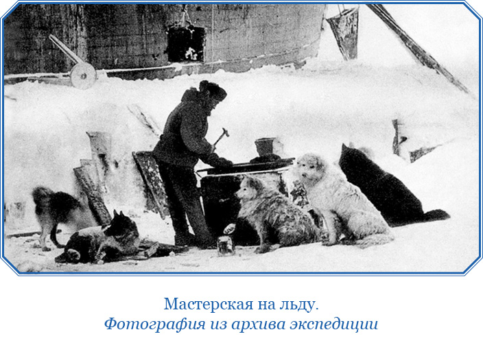Тем временем Пан в своем задоре подошел слишком близко к краю полыньи и провалился в воду. Лед был настолько высок, что собака никак не могла без посторонней помощи выкарабкаться, и, если бы я ее не вытащил, она бы, пожалуй, утонула. Теперь Пан лежит у нас в кают-компании, сохнет и отдыхает. Интересно, что пробыв довольно долго в воде, пес, однако, не вымок насквозь; подшерсток его густой шубы сух и тепел. Для собак вообще праздник попасть сюда вниз, где им не часто доводится бывать. И уже попав, они все каюты обегают, все углы обнюхают и лишь после этого, отыскав уютное местечко, улягутся.
