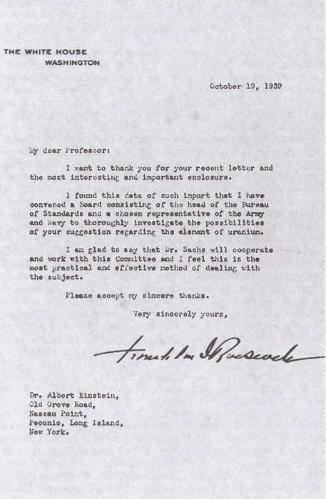 Сакс вручил президенту подробный меморандум, подготовленный физиками (он датирован 11 октября), и сопутствующие материалы (включая особый, сугубо научный меморандум Сциларда), в которых доказывалось, что проводимые исследования имеют «выдающееся значение для национальной безопасности». Речь шла об открытии Сцилардом и Ферми возможности расщепления урана нейтронами с последующей цепной реакцией.
