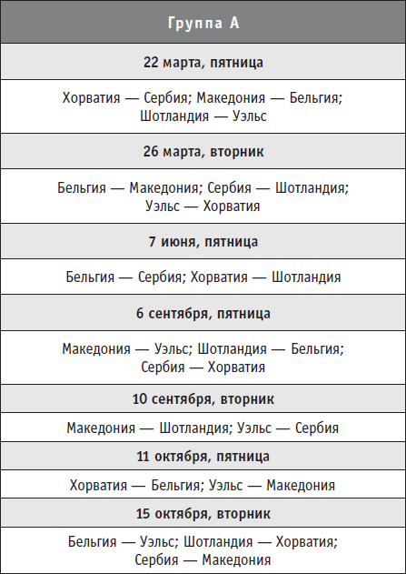 прохождения на чемпионат мира для европейских сборных, наверное, самые жесткие в сравнении с другими континентами. Количественно европейских сборных в финальной части турнира, конечно, больше, чем от Южной Америки, Африки, Азии, но при этом и отбор сегодня идет уже не из трех десятков стран, как это было два десятилетия назад, а из 53. Так что история традиционная: первые места в каждой из отборочных групп едут в Бразилию напрямую (и имена этих девяти счастливчиков мы узнаем уже в октябре), а вот вторым придется еще пройти через сито стыковых матчей.Есть группы посильнее и послабее. Одна из самых слабых – группа А, чудесным образом составленная из трех бывших югославских республик, двух британских команд плюс неудачника прошлого отборочного цикла – сборной Бельгии. Кто здесь станет фаворитом, сказать сложно. Не исключено, что очки в каждом матче могут доставаться теоретически любой из сборных и к финальным матчам в сентябре – октябре могут нарисоваться самые разнообразные расклады.