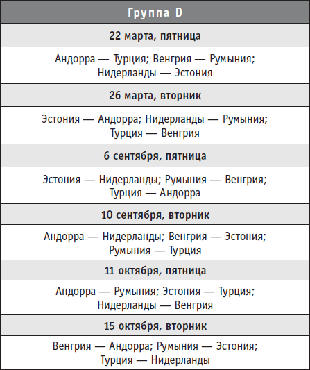 В группе Dза верхнюю строчку, скорее всего, больше шансов сразиться, пожалуй, у голландцев. Думается, что желание реабилитироваться в глазах болельщиков за провал на Евро-2012 окажется сильнее, чем традиционно сильная турецкая сборная или команды из Восточной Европы. Сборной Эстонии вряд ли суждено второй раз подряд уцепиться за вторую строчку.