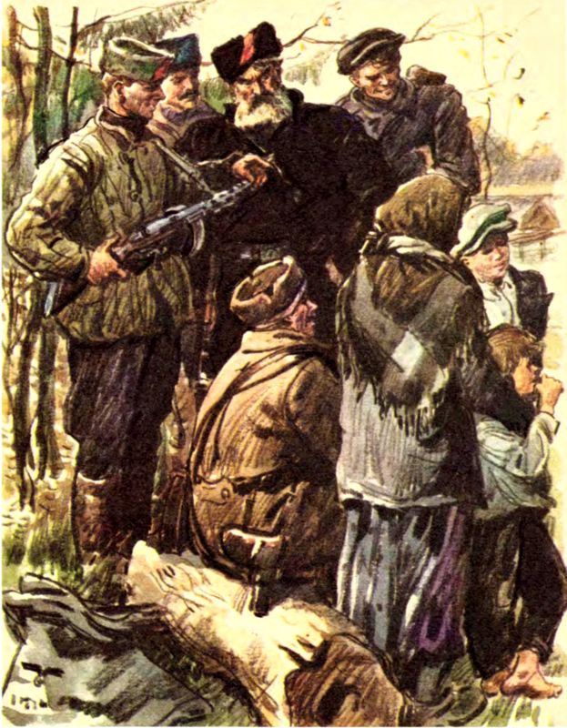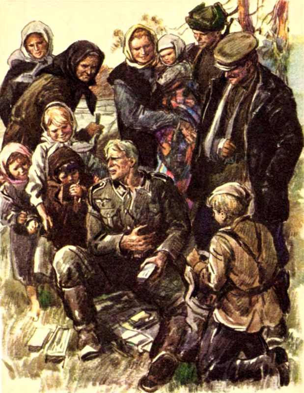 С удивлением разглядывали пленного женщины и дети. Фашисты — ведь это не люди. Они хуже зверей. У них и обличье должно быть ужасное. А этот на обыкновенного человека похож. Пожилой, худощавый, совсем не страшный.
