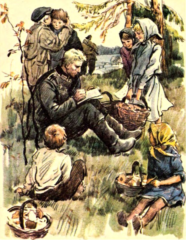 …Собравшись в кружок, ребятишки и бабы, жуя шоколад, смотрели, как Фюнфкиндер работал. Ленька выгребал ему из мешков лекарства, а немец прочитывал надписи и раскладывал коробочки с порошками, баночки, скляночки аккуратно, не торопясь. Словно чуял — чем раньше кончит работу, тем скорее отведет его Власыч в лес.