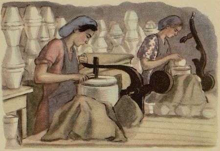 Бабушка остановилась посмотреть, как машина подавала снизу фарфоровую глину, из которой делают посуду. А Галя побежала посмотреть, что за круги вертятся на столах возле каждой работницы.