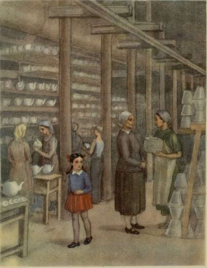Галя ещё не знала, что посуда должна хорошо просохнуть, потом её протрут наждачной бумагой и направят в очень жаркую печь для обжига. Потом посуду покроют глазурью, чтобы она блестела, и опять обожгут, и только тогда она пойдёт в живописный цех. Там её разрисуют, сделают нарядной и опять пустят в печь для обжига, чтобы краска не стиралась. Много ещё будут трудиться люди, чтобы все эти кружки, чашки и тарелки вышли блестящими, красивыми и прочными.